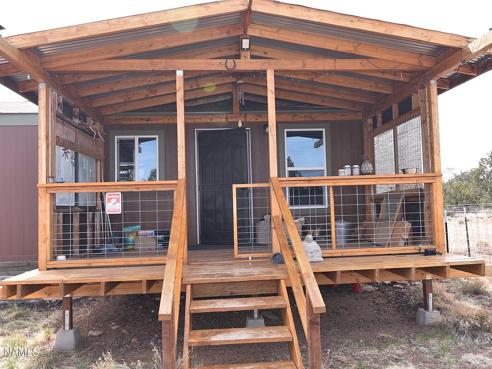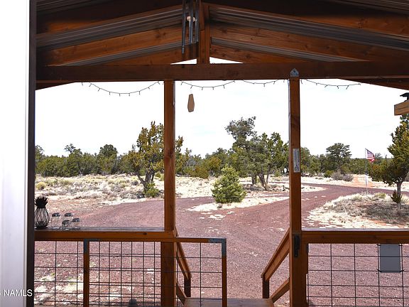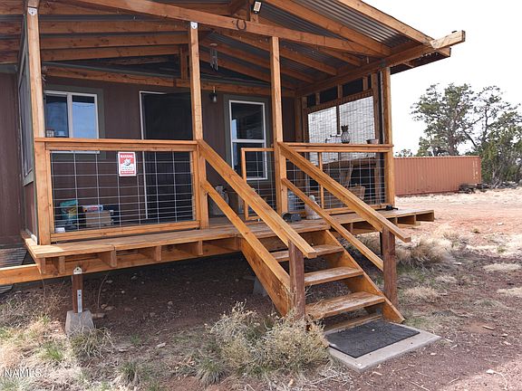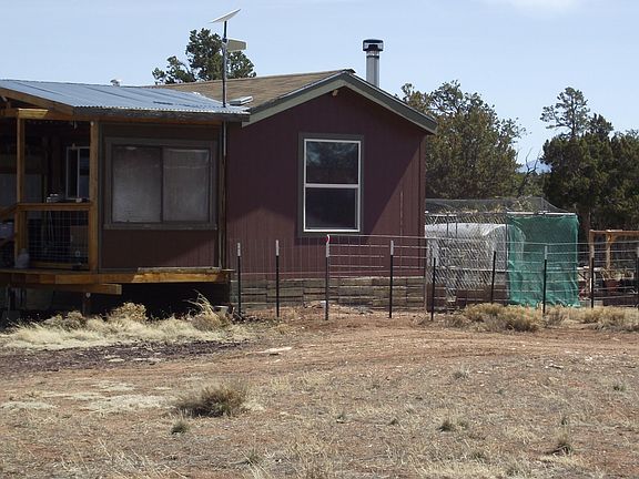 A serene 36-acre ranchette on maintained roads in South Rim Ranch featuring a shooting range, solar power, and a fenced, established garden. Equipped with two large water cisterns—one dedicated to the home and the other to the garden—propane, and a fenced backyard. This quiet property is right up against the undeveloped Babbitt Ranch, offering stunning views, mature trees, and beautiful night skies. Approved and installed septic system is in place, though the 650 sq. ft., 2-bedroom, 1-bathroom singlewide mfg home has not been county inspected. Perfect for full-time living or a summer retreat. Additional amenities include a 40-foot Conex container, two spacious sheds, a propane stove and oven, a Weboost phone booster, and a generator. which is the back-up for the solar system.