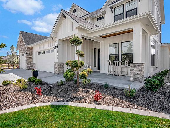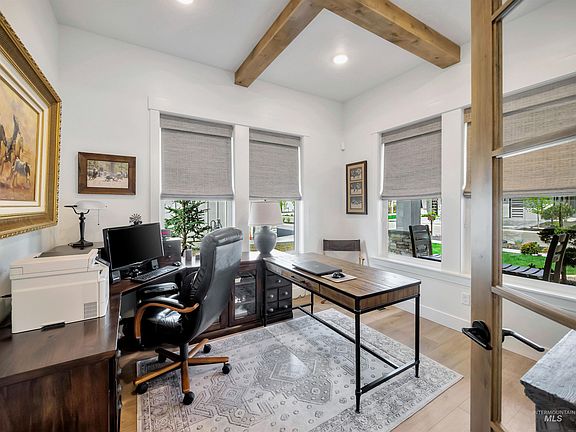 Better than new! This home has an unmatched combination of luxurious design & unparalleled quality in the coveted community of Legacy. Intentional floor plan provides flexibility, (5 beds or 4 beds & bonus) a sought-after main floor master + dedicated den/office. Eye-catching details include beautiful wide-plank flooring, extensive trim work, wood & shiplap accents, sophisticated lighting, raised white brick hearth w/ floating mantle & custom built-ins + large study nook upstairs. Gourmet kitchen boasts large island, floor-to-ceiling cabinetry, Bosch SS appliances w/ built-in gas range, & spacious walk-in pantry. Primary Suite feat. a luxurious en-suite bath w/ direct access to the laundry. Upstairs all bedrooms have access to en-suite baths. Nestled on a pristine corner lot w/ water views, purposefully landscaped, custom paver patio & firepit + tongue & groove cedar plank lined ceilings on both patios where you can enjoy all of Idaho's four seasons.