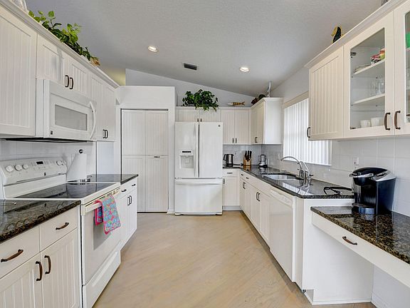 :IMMACULATE HOUSE SITS ON A CORNER LOT AND FEATURES WOOD FLOORING IN THE MAIN LIVING AREAS AND KITCHEN. KITCHEN WAS REMODELED WITH BEADBOARD CABINETRY FINISHED WITH CROWN MOLDING,GRANITE COUNTER TOPS. BAY WINDOWS IN THE KITCHEN AND TRANSOM WINDOW IN THE LIVING ROOM BRING IN AN ABUNDANCE OF NATURAL LIGHT, WHICH MAKES THE OPEN FLOOR PLAN VERY BRIGHT. THE TILED,SCREENED AND COVERED PATIO ARE OFF THE LIVING DINING AREA. THE LARGE OWNERS SUITE BOASTS PLANTATION SHUTTERS, TRAY CEILINGS, NEW TILE FLOORING AND CROWN MOLDING. THE MASTER BATHROOM HAS A NEW VANITY, A ROMAN TUB AND SEPERATE SHOWER. THE 3RD BEDROOM IS TILED AND HAS A CLOSET BUT CAN BE USED FOR AN OFFICE OR DEN. A/C WAS REPLACED IN 2019. VALENCIA LAKES HAS LUXURY RESORT STYLE AMENITIES INCLUDING SHOWS, CLUBS, AND MUCH MORE