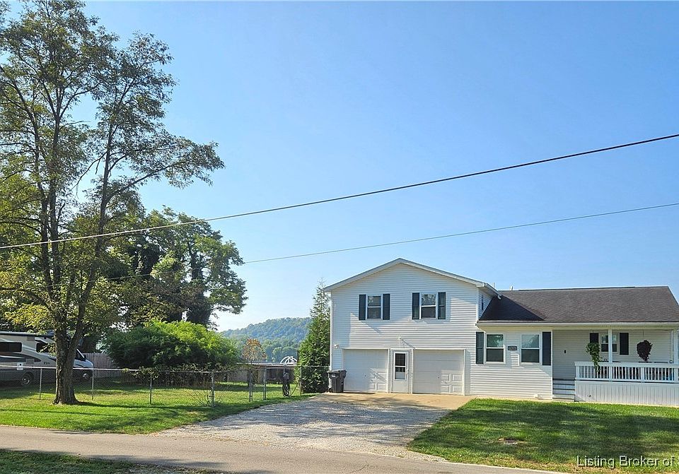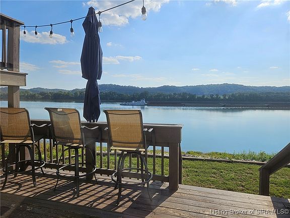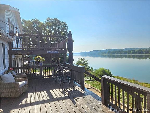 This extraordinary Riverfront property showcases stunning panoramic River views from both inside and outside. IMPORTANT -the historic flood of 2025 did NOT get into the living space of the home. Some water got into the unfinished basement, but has all been cleaned out, so no flood damage. As you step onto the charming porch, you will be impressed by this home. The property sits on a double lot, offering extensive outdoor space, a newer swimming pool, and a tranquil setting. Located on a dead-end road, it provides a peaceful setting, just a few minutes drive from the vibrant downtown Madison, IN area. This haven offers a unique blend of comfort and convenience, featuring fiber optic internet, a comfortable layout, lots of closets, public water & sewer, and paved roads. Recent upgrades include a newer HVAC system, water heater, exterior doors, thermopane windows, and light fixtures. The genuine hardwood flooring in the entry and kitchen is a standout feature. The large multi-level deck and concrete patio provide great opportunities to enjoy the panoramic River views. Additional storage is offered with a berm shelter house, an attached garage, a dry basement, and a spacious yard barn. This property is a rare gem and would benefit anyone that is interested to take a look at it sooner than later!