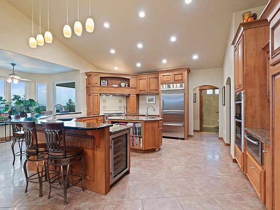 Custom-built home with luxurious finishes, exceptional features and incredible views. The gourmet kitchen is a standout, featuring a Wolf dual-fuel range with a pot filler, double ovens, a warming drawer, wine fridge, granite counters, an eating bar, and a spacious island. Host dinners in the formal dining room. The main floor primary suite offers a vintage clawfoot tub, walk-in shower, and large walk-in closet. Solid wood doors and trim add timeless elegance throughout. The lower level includes a 2-bed, 1-bath in-law suite with its own private kitchen, ideal for multi-generational living or guest accommodations. The home is designed for relaxation and entertainment, featuring a steam sauna, jetted tub, and a home theater. Both decks are plumbed for gas, perfect for outdoor gatherings or enjoying the stunning sunsets. Additional highlights include a bank-grade walk-in safe & 2nd kitchen in the garage for added convenience. This home combines high-end design with thoughtful details.
