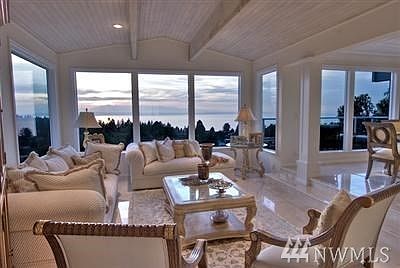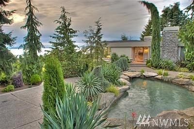 Majestic PROTECTED 180 degree western view of Olympic Mtns, Puget Sound & Glorious Sunsets. Beautiful Resort in a secluded paradise that you never want to leave. This architect's own home is at the end of the road; no drive by traffic. Lush landscaping w/ year 'round colors on over ½ acre. Streams, ponds & Spa w/ waterfalls delight your senses. Privacy & tranquility. Designed for living & entertaining w/lots of natural light. Stone, iron, and wood finishes enhance the interior.