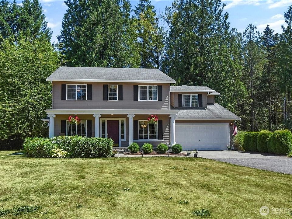 Beautifully upgraded 4 BR/2.5 bath + bonus area/den home on private 2.4 acre lot. Built in 1998, this classic home provides 2,140 sq. ft. of flexible living space. Gorgeous new Maple hardwood floors throughout home. Kitchen features maple cabinets, granite countertops & sliding glass door that opens to a large, private sundeck. Inviting family rm has a fireplace w/an elegant mantel & granite surround. Formal living & dining rms. Spacious Primary suite has an adjoining bathroom w/soaking tub & shower. Big picture windows provide peaceful views of this special natural setting. Private land offers expansive play spaces, garden area, shed and RV parking. Just 20 minutes to Redmond and close to shopping, schools, parks & scenic trails.