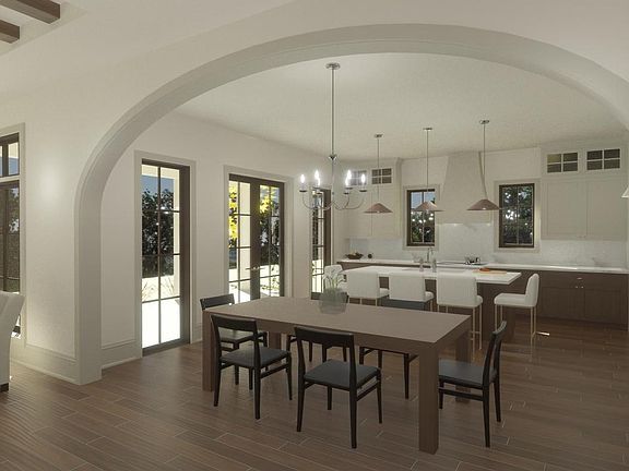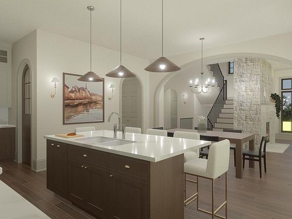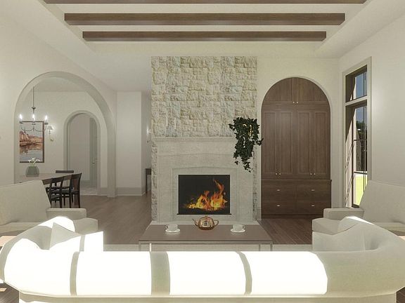 Cozy stone fireplaceSpa-inspired bathDormer windowsArched entrywaysPitched roof linesDual patios