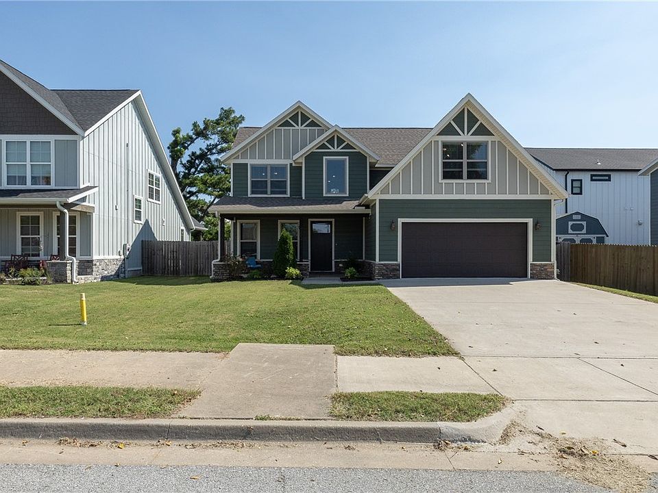 This is exactly the type of space you've imagined for yourself, a perfect balance of modern finishes and classic styles, high ceilings and natural light, all within walking distance to DT Rogers, bike paths and more. Picture yourself welcoming guests to your friendly porch or enjoying a relaxing evening on your covered patio(w/woodburning fp!) or any of the stylish rooms inside the home as well. The open floor plan showcases a view of the stylish architectural lines and the plethora of cabinets, granite counters, SS appliances and a fantastic pantry, plus the modern brick fireplace, built-in shelving and hardwood flooring throughout the entire main level to include the main bedroom suite and home office. That main suite offers access to the covered patio, and a gorgeous bath with fully tiled shower, beautiful finishes and a spacious closet. Upstairs, you'll find 3 spacious bedrooms (one of which is perfect as media room) and another full bath. Don't miss this chance, you'll want to come see this home right away!