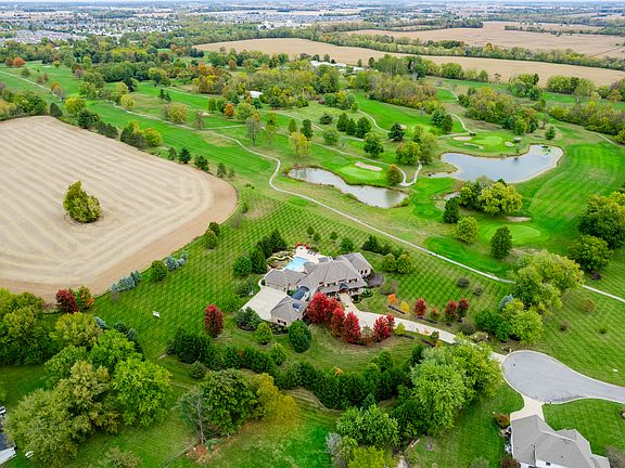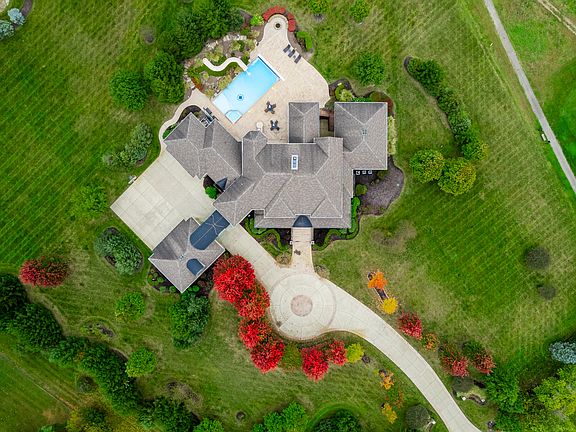 This stunning estate is nestled on a sprawling 22 acres in Greenfield, Indiana at the southern end of Hawk's Tail golf course, just beyond the 13th green. As the designer, Dale Hughes described the residence, "It has a bit of old-world design, a twist of Tuscan, stately, elegant, yet livable and comfortable." It's a testament to timeless craftsmanship and modern luxury. Don't bother leaving the comfort of your own home with a dedicated half court gymnasium complete with a workout space, locker room, and steam shower. Don't forget to step outside to a spectacular pool with a slide and jacuzzi, a loggia and outdoor kitchen beckoning you to unwind and savor the Indiana sunshine.