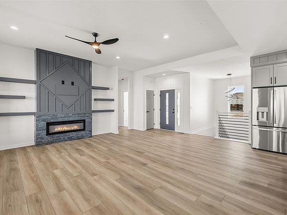 The main level offers an open-concept layout: a spacious living room with 10' ceilings, an electric fireplace, and abundant natural light is perfect for everyday living and entertaining. The kitchen boasts a center island, soft-close dovetail cabinets and drawers, GE appliances, a walk-in pantry with built-ins and convenient garage access, and flows into the dinette with a door leading to the oversized covered deck. The main level also includes two bedrooms and a full bath with tile surround and flooring, plus a primary suite featuring a tray ceiling, double vanity, tiled shower, tile flooring, and a walk-in closet. A drop zone and laundry room add functionality.