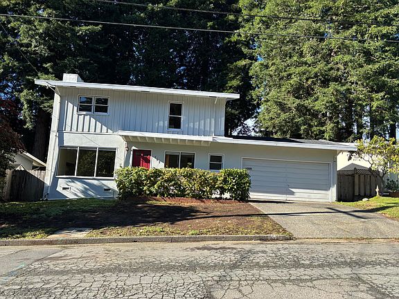 Downstairs there is a living/dining room with fireplace, small study with closet, remodeled kitchen with eat-over bar and half bath. The attached garage with automatic door has laundry hook-ups and direct access to the kitchen and backyard. Upstairs there are three bedrooms and a full bath that has been nicely remodeled. The large backyard has a greenhouse and mature rhodies, ferns, camillas and a stunning tulip tree when in bloom. There's a small patio for enjoying the towering redwoods that surround the property. New roof on second story and garage in 2024.