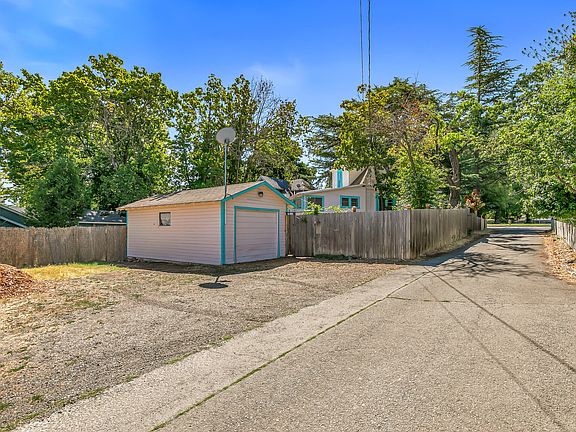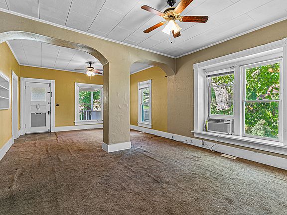 Historic home on a spacious lot with ~121 feet of alley access — centrally located across from Triangle Park! Living and formal dining with high ceilings, curved archways, built-ins, and ceiling fans. Kitchen with tiled counter and backsplash, stainless double sink, refrigerator, and gas range; adjacent informal dining or breakfast nook with built-ins. Main-level bedroom with abundant natural light and second bedroom or office with built-in cabinets and shelving. Full bathroom with pedestal sink and tiled tub shower. Enclosed back porch mudroom with washer and dryer. Two upper-level bedrooms with closets and ceiling fans. Exterior stairs to lower-level basement with poured concrete foundation. Fully fenced yard with mature trees, sunny gardening areas, gated alley access, and large parking area with space for multiple vehicles. Detached 288 SqFt garage with power, storage shelving, and poured concrete slab. Property shall be sold ''As-Is'' in present condition. Inquire for details!
