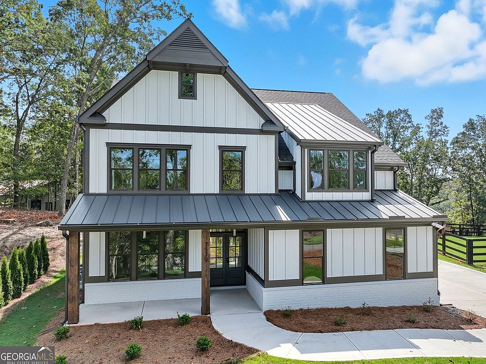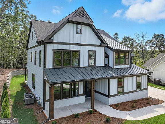 Discover unparalleled luxury at The Reserve Club & Marina, where this exquisite 4-bedroom, 4-bathroom residence redefines sophisticated lakeside living on the shores of Lake Lanier. Nestled within an exclusive gated community, this custom-crafted home seamlessly blends modern elegance with timeless farmhouse charm, captivating discerning buyers and realtors alike from the very first glance. The moment you arrive, the home's striking exterior commands attention. Light board-and-batten siding, accented by bold dark trim and expansive multi-pane windows, creates a refined yet inviting aesthetic. A gracious front porch, framed by rich stained cedar columns, beckons you to step inside, while the side-entry two-car garage, crowned with a matching cedar header, elevates the home's curb appeal to an art form. Cross the threshold through elegant double front doors into a luminous foyer that sets the stage for the impeccable design within. The main level unfolds with effortless sophistication: a versatile office (or potential fifth bedroom) overlooks the serene front porch, while the dining room, adorned with a coffered ceiling, board-and-batten paneling, and a sleek modern chandelier, promises memorable gatherings. The chef's kitchen is a culinary masterpiece, boasting 42-inch white cabinetry, premium KitchenAid stainless steel appliances, a 5-burner gas cooktop with a custom hood, a pot filler, under-cabinet lighting, a mini wine fridge, and a center island perfect for entertaining. The adjacent family room, anchored by a cozy gas fireplace and flanked by bespoke wall-to-wall built-in shelving, invites relaxation and connection. A full bathroom with a frameless shower door completes this thoughtfully designed level. Step outside to an entertainer's paradise, where a generous covered patio, equipped with a ceiling fan and TV connection, flows seamlessly from the indoor living spaces. An uncovered patio extension invites sun-soaked afternoons, while the expansive, flat, private backyard offers endless possibilities for outdoor enjoyment, from leisurely lounging to lively gatherings. Upstairs, the primary suite is a sanctuary of indulgence, featuring a tranquil sitting area, elegant tray ceiling, and breathtaking views. His-and-hers closets provide ample storage, while the spa-inspired en-suite bathroom dazzles with a freestanding soaking tub, a frameless glass shower, and a luxurious double vanity. Three additional bedrooms-one with a private bath and two sharing a beautifully appointed bathroom-offer comfort and style for family or guests. A well-equipped laundry room with cabinetry, countertops, and a sink adds practicality to the home's opulent design. Modern conveniences elevate the experience further, with beautiful flooring throughout, sleek black LED fixtures, smart ceiling fans, intuitive smart home features, soft-close kitchen drawers, and a tankless water heater ensuring efficiency and elegance. As a resident of The Reserve Club & Marina, you'll embrace the coveted Lake Lanier lifestyle, with access to a community dock for day use, jet ski ports and kayak racks for lease, a resort-style pool, and a stunning clubhouse that redefines leisure. The community's private boat slips are sold out, but may be available for lease. This is more than a home-it's a lifestyle masterpiece, meticulously designed to inspire awe and envy. Don't miss the opportunity to experience this rare gem in person. Schedule a showing today and step into the elegance, luxury, and lakefront allure of The Reserve Club & Marina. Your dream home awaits.