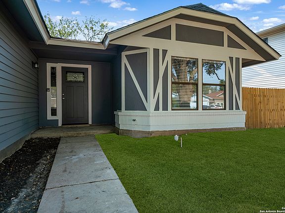 Remodeled and move-in ready, this stunning single-story home offers 3 spacious bedrooms, 2 full baths, and a bright, modern interior. Inside, a wall of windows across the back fill the open living area with natural light, complemented by beautiful finishes like new luxury vinyl plank flooring (no carpet!), and neutral paint. The stylish kitchen opens to the spacious family room with a wood-burning fireplace and sliding glass doors to the backyard, and includes quartz countertops with custom backsplash, black appliances, grey cabinetry, and a breakfast bar. Both bathrooms have been tastefully updated with quartz counters, new vanity cabinets, under-mount sinks, framed mirrors, custom tile surrounds, and new fixtures. Outside, enjoy a spacious backyard with new privacy fence and covered patio, plus mature trees in the front and back, offering shade and curb appeal. The roof was replaced just 7 years ago, and the water heater is new, offering peace of mind and added value for years to come. This home is located in a well-maintained, walkable neighborhood just blocks from Spring Meadow Elementary and Ventura Community Pool. With nearby shopping, restaurants, and coffee shops-and only about 12 miles from downtown San Antonio-this one checks all the boxes!