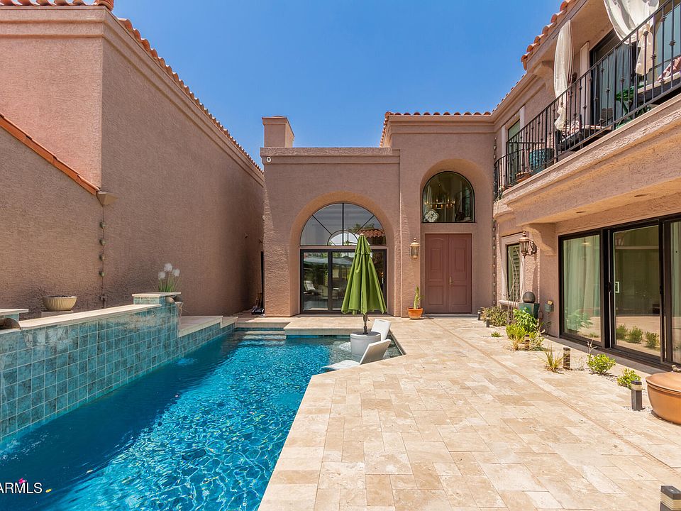 Welcome to a rare architectural gem in Scottsdale's desirable La Mariposa at McCormick Ranch. This fully renovated 3-bed, 3-bath home artfully blends timeless character with modern sophistication. Designed for an exceptional living experience, nearly every room opens to a stunning central courtyard featuring a shimmering pool and travertine decking, your private indoor-outdoor oasis. Bathrooms feature exquisite tadelakt showers, kitchen with Taj Mahal quartzite countertops, and wide-plank white oak flooring extends throughout the living spaces. Two brand new Bosch HVAC units were just installed, ensuring year-round comfort and efficiency. Meticulously crafted with quality and care, this one-of-a-kind residence offers peaceful living in an unbeatable location.