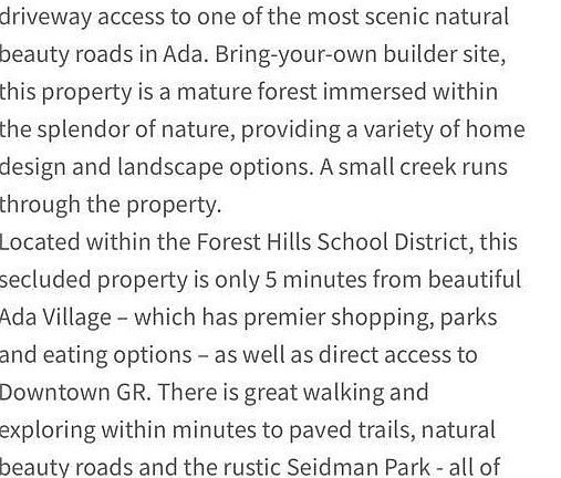 BRING YOUR OWN BUILDER! 3.12 Acre wooded site (C) on 'Split Oak Ridge' development located with direct driveway access to one of the most scenic natural beauty roads in Ada. Bring-your-own builder site, this property is a mature forest immersed within the splendor of nature, providing a variety of home design and landscape options. A small creek runs through the property. Located within the Forest Hills School District, this property is only 5 minutes from beautiful Ada Village (premier shopping, parks and dining) as well as easy access to Downtown GR. There is great walking and exploring within minutes to paved trails and Seidman Park providing peaceful hikes or biking.