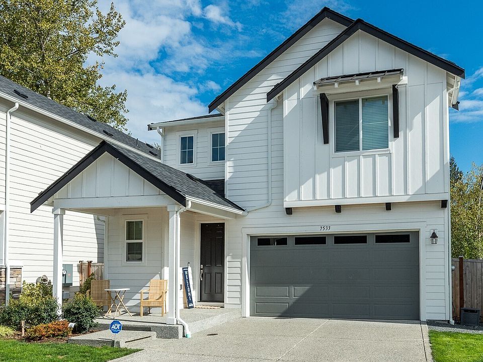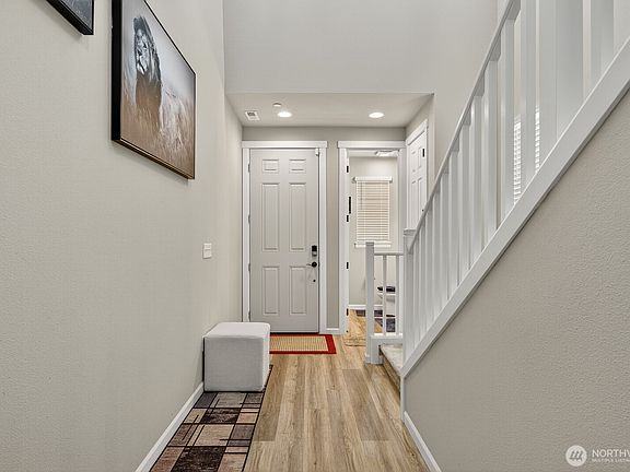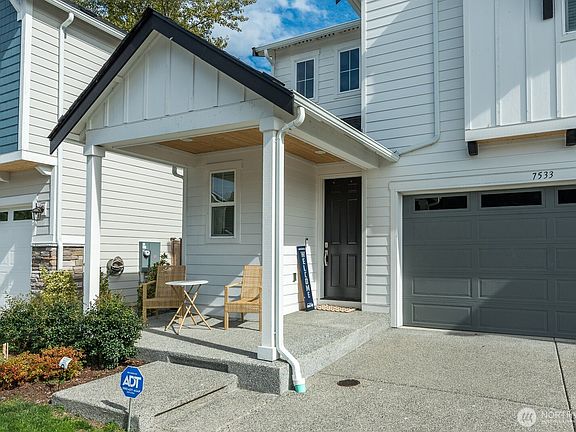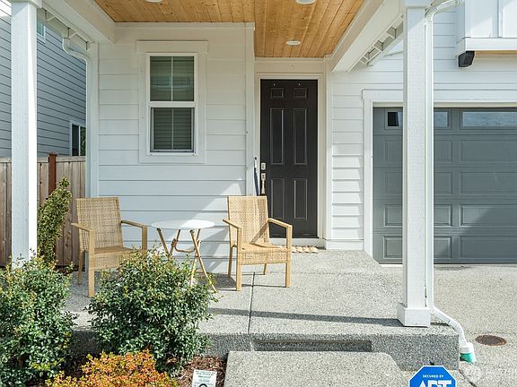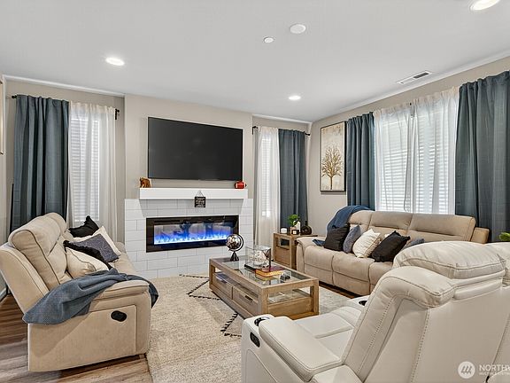 Exceptional quality, charm & style shine through in this 2,080 sq ft home offering modern comfort & convenience. Immaculately cared for "like new" home is nestled in the perfect location backed up against the greenbelt & features open concept living w/ vaulted ceilings, tall windows & doors, color changing glass fireplace in cozy living room, upgraded black fixtures & accessories, heat pump & A/C, white marble counters in luxurious kitchen & baths, tons of storage & much more! Enjoy rear covered patio w/ lights & fully fenced back yard. Nice sized bedrooms, laundry & huge living area all on upper floor. Impressive primary bedroom & 5-piece bath w/ soaker tub, dual sink vanity, large glass shower w/ black accenting & massive walk-in closet.