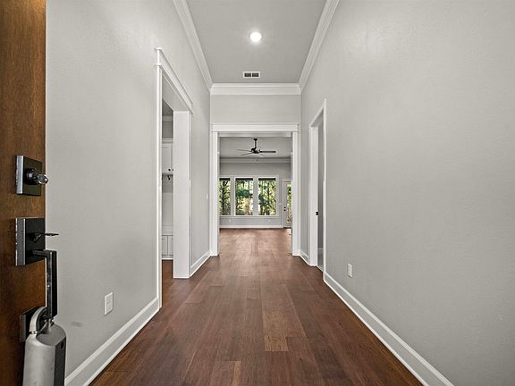 Fantastic new construction in Hadley Court at Oak Hollow. This gorgeous home is buttoned up and ready for its new owners! Open concept living/kitchen/dining with wood floors and large windows overlooking the beautiful trees past the backyard fence. Kitchen offers beautiful quartz countertops and oversized island with seating, stainless appliances and pantry. Primary bedroom also overlooks the park like views in back with massive en-suite bath with walk in shower, soaking tub, separate vanities and oversized walk in closet. There's also two nice guest rooms that share a bath and a fantastic laundry room with sink and mudroom built in areas off the garage. Large covered back porch is ready for entertaining come see this beauty today!