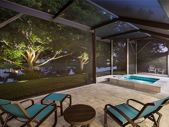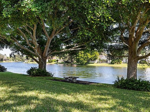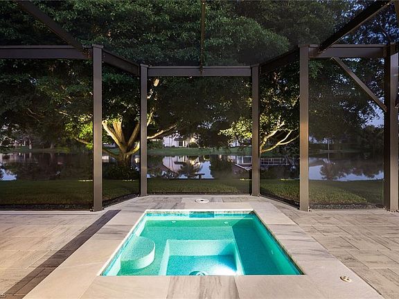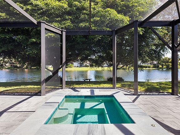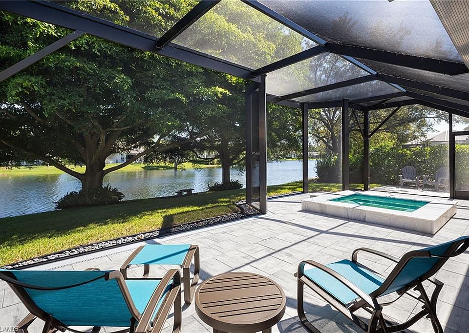 A serene lakefront setting is the backdrop to this timelessly charming home in Monterey, with a fabulous design package by award-winning Sand Dollar recipient Jinx McDonald. Southeastern sparkling lake views with gorgeous landscaping provide you with your private oasis. Offering a newer (2022) marble spa, picture frame screen and beautiful pavers, the outdoor space is done to perfection. The home sits on a quiet lot and boasts an open great room floor plan, 12-foot ceilings, custom woodwork details on the ceiling in the breakfast nook and beautiful wood floors throughout the living area. Other improvements include a paver driveway, new roof in 2018, new HVAC in 2021 and new water heater in 2023, plantation shutters, crown molding and meticulous condition. Excellent layout with a lovely white kitchen with loads of bells and whistles, spacious breakfast room with fabulous custom dining table and built-in bench, and large covered area on lanai. Oversized study could easily be converted to a third bedroom. Monterey is an active, sought-after community less than three miles to the beach, Mercato and Waterside. Amenities include a 24-hour guarded gatehouse, renovated clubhouse, newer fitness center, billiards, heated lap pool, basketball and pickleball court, new play area, active tennis with a pro and three lighted Har-Tru tennis courts. A-rated public schools and three excellent private schools within three miles.