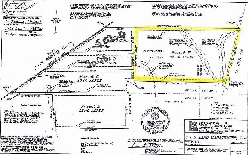 Excellent development opportunity or private setting for your new home on 43.16 acres in the beautiful, quiet Folsom. Convenient location with easy access via Hwy 40 to Folsom and Hwy 437 to Covington. Flood Zone C. Multiple parcels available up to 95 acres, perfect for quiet living or your equestrian estate. See attachments for drawing with additional parcels.