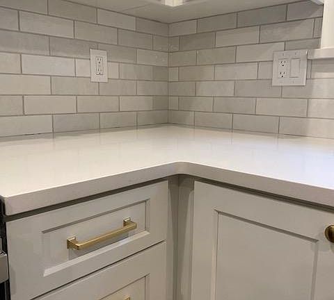 - Kitchen features abundant storage and a generously-sized peninsula with stone quartz counters and hand-glazed ceramic backsplash tiles