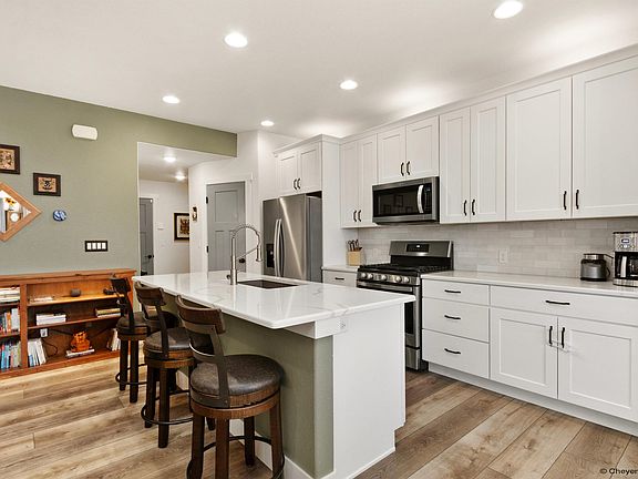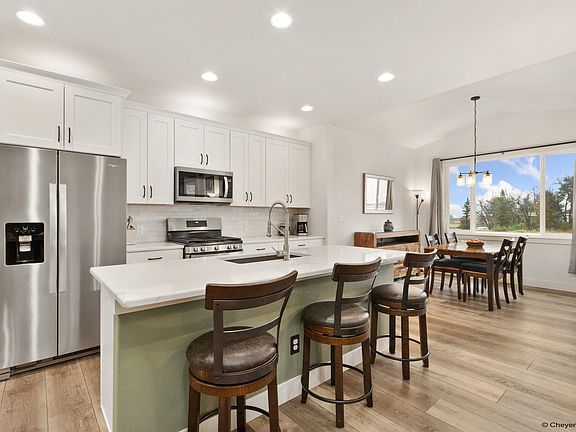 Rare opportunity to own a better-than-new, 4 bed/3 bath single family home in the highly-desired Saddle Ridge neighborhood for under $500,000(and no HOA fee)!! This stunning home, built in 2022, features thoughtful high-end upgrades throughout. The cozy great room is anchored by a chef’s kitchen with upgraded gas range, an eye-catching gas fireplace, and surround sound wiring – no better spot to curl up with a book or watch a movie on a snowy winter day! The kitchen and bathrooms feature oversized soft close cabinets and quartz countertops, and the upgraded Kraus commercial-style kitchen faucet features a dedicated drinking water dispenser and under-counter water filter. Hardwired fiber internet connection, and multiple smart home features abound throughout the house. The basement includes a fully finished and permitted fourth bedroom with a large walk-in closet, as well as a partially finished den/rec room (with HVAC, electrical circuits, and surround sound wiring for a home theater system!), multiple storage areas with built-in shelving and is plumbed for a fourth bathroom. The extra deep finished garage includes additional built-in storage shelves and is large enough to park your truck, measuring 23.5 ft from door to wall! And one of the best features of this property! It embodies the peacefulness of rural living with the perks of being located within city limits, only 10 minutes from downtown Cheyenne and 45 minutes from Fort Collins. The covered, maintenance-free composite back deck is wired for outdoor speakers and overlooks a lush, fully-fenced and landscaped backyard – large enough for kids and/or dogs to run and play, small enough to mow in 15 minutes– and features over 30-feet of colorful raised perennial pollinator gardens with drip irrigation (which can be controlled, along with the yard sprinklers, from your smartphone)! Beyond the backyard, the property looks out over rural county parcels and open high prairie to the south(Longs Peak and the Front Range can be seen to the southwest from the deck!), while the house fronts an open field which is ultimately planned for a future Laramie County elementary school. The home also includes an energy efficient, on-demand gas water heater and a Ring security system with video doorbell.