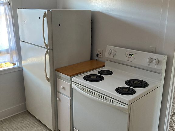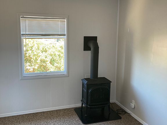 Upstairs in classic older building, newly renovated with carpeted floors in living area, bright living space with charming gas fireplace