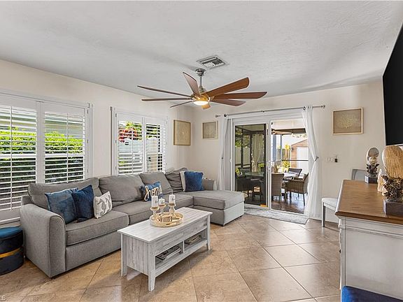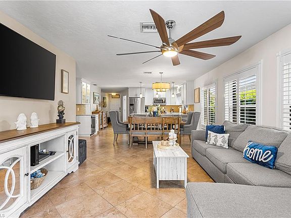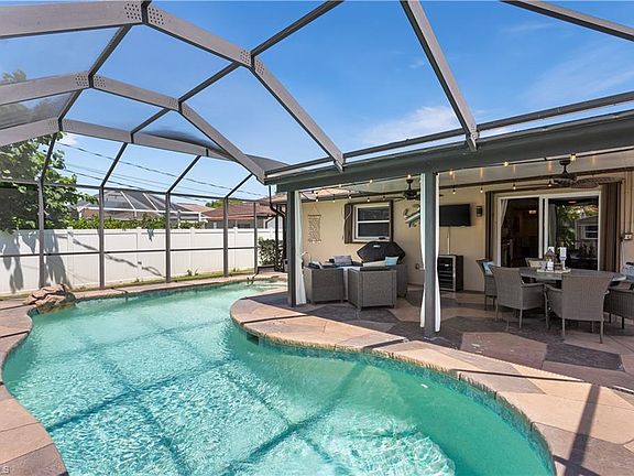 This extensively upgraded and remodeled 3-bedroom plus den, 2-bathroom home in the prestigious community of Naples Park epitomizes the sought-after coastal contemporary style. Located in a family-friendly community, this home is within walking or biking distance to the white sands of Vanderbilt Beach and the fabulous restaurants and shopping at Mercato. The interior boasts custom paint colors, tile floors throughout, plantation shutters and blinds, designer ceiling fans, and a custom built-in desk and storage in the den/office. The updated coastal kitchen features custom cabinetry with Lazy Susan and pull-out shelving, beautiful granite countertops, a tiled backsplash, stainless steel Samsung appliances, a wine cooler, pendant lighting, and a skylight. The fully remodeled main bathroom includes all-new tile, a custom vanity and sink, and a large walk-in shower with frameless shower doors. Step outside to your private tropical oasis in the fenced backyard, featuring a screened lanai, a spectacular free-form pool, a storage shed, and lovely landscaping. This Naples Park home offers the perfect blend of style, comfort, and convenience in a prime location.
