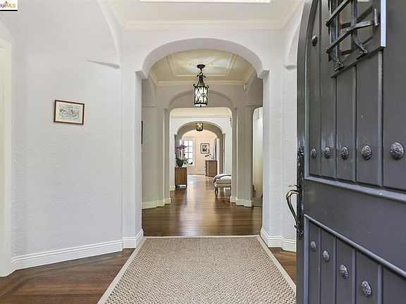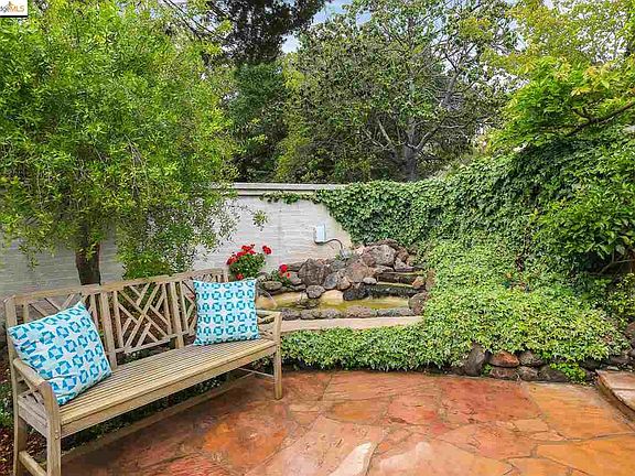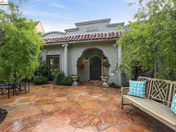 Basking in the Berkeley Hills, this garden-centric villa showcases sweeping Bay views. Influences of California Mission Revival architecture embellish the home and property. The four-bedroom, three-bathroom interior features boldly scaled window and glass-door expanses inviting in the captivating surroundings and linking seamlessly to enchanted outdoor living spaces, optimizing the joy of indoor-outdoor living.A fanciful iron gate threaded with wisteria gives way to the flagstone-mosaic courtyard. Within its ivy-draped walls, inset stone benches encourage a sojourn in this al fresco room, framed by a stone-edged pond, billowy outline of trees and flowering perennials, and the home's romantic facade. Enter to a light-infused interior, where the arch motif continues and the sturdy majesty of textural whitewashed walls stands in bright contrast to dark hardwood floors. Presenting Bay panoramas, this public area opens to a multi-level deck, a grand platform for relishing views while dining, lounging, and hot tubbing. Beyond it, the garden unfurls with lawn and abundant flora bisected by a pea-gravel strolling path encircling a stone fountain.The kitchen, throughout its expansive dine-in layout, embodies rustic elegance, combining an exposed-beam ceiling, masonry hood, lustrous dark-wood counters and copper sink. High-caliber appliances include double ovens and a five-burner cooktop, and copious cabinetry is augmented by a pantry.Two front bedrooms overlook the courtyard and open to it via double doors of undivided glass. Both hall and master bathroom, just updated, are graced with timeless gray marble. Two lower-level bedrooms, one of which captures Bay views and opens to the hot-tub deck, are served by a bathroom featuring an earthy tile scheme. Spacious beyond measure, the lower level features a potential office, plus storage, wine, laundry rooms, and bonus bathroom. An attached multi-car garage offers further storage.