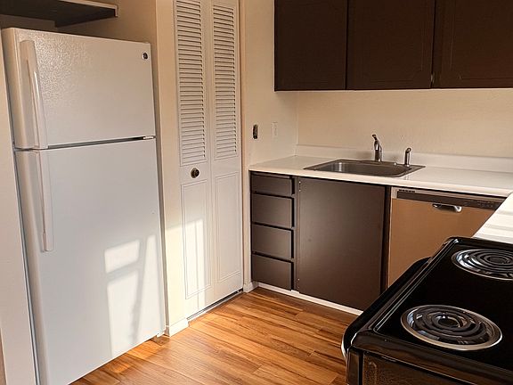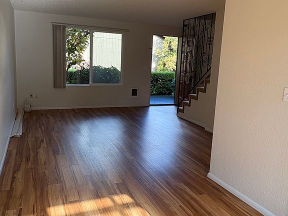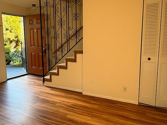 Vinyl laminate hardwood flooring, new carpeting upstairs and in bedrooms. Freshly painted. Private fenced patio area. Eating area just off kitchen. Wall heat, electric stove, stainless steel dishwasher.