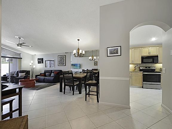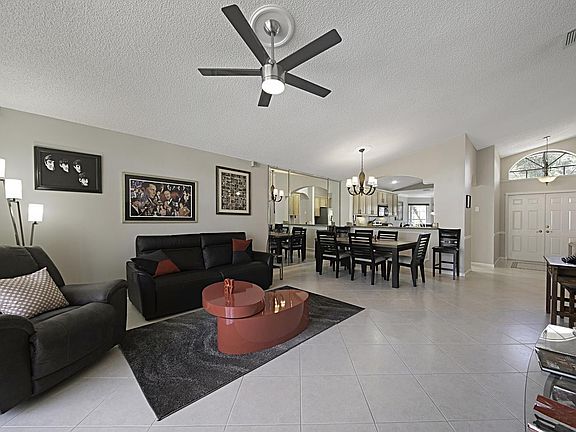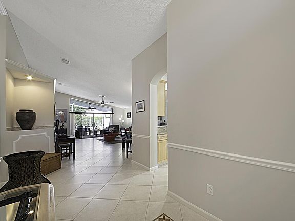 Discover the elegant style and casual comfort of this 3 bedroom, 2 bathroom home. Perfect for entertaining with a living room, formal dining area and screen enclosed patio. The chef's kitchen includes granite countertops, under cabinet lighting, tiled backsplash, stainless steel appliances, high hat lighting, a snack bar and a breakfast nook. Master retreat boasts a door to the patio, a walk-in closet, double sinks, a soaking tub and a walk-in shower. This home also features neutral tile laid on the diagonal, crown molding, a screen enclosed entrance and an abundance of natural light. Enjoy quiet evenings on the spectacular extended screen enclosed patio with a view of the private yard. Valencia Lakes has first class amenities that include a clubhouse, social room with a stage, fitness center, game rooms, billiards room, resort style pool, hot tub, tennis and library. Located close to shopping, dining, entertainment, major highways and airports.