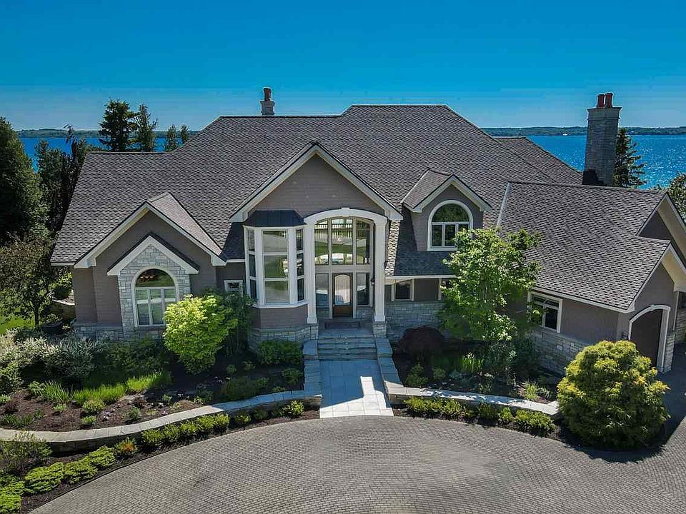 This estate-sized, lakefront home has over 6400 square feet of finished living area, featuring 5 bedrooms, 5 baths, and extensive stone landscaping with entertainment areas, water features, and ponds. You'll be mesmerized by the stunning lake views during the day and the breathtaking sunsets at night. Step through the grand entrance into the living room with soaring two-story ceilings and an entire wall of windows framing panoramic views of Lake Charlevoix. The gourmet kitchen with an island/snack bar seamlessly opens to a dining area surrounded by water views, creating a perfect space for entertaining or quiet meals at home. Equipped with a walk-in pantry, two dishwashers, refrigerator drawers, and new double ovens, this kitchen is designed for both functionality and style.The luxurious primary suite, conveniently located on the main floor, features a fireplace, built-ins, a sitting area, a private patio overlooking a pond and the lake, and a private office. The ensuite bath is a sanctuary designed to revive and refresh, with a large double vanity, walk-in shower, jetted tub, make-up and sitting areas, and a huge double-sided walk-in closet. The first floor also boasts a very large laundry room with ample storage and a dog shower, heated floors throughout the home, ample storage, a wet bar perfect for entertaining, and a cozy family room. The versatile upper level has an array of spacious bedrooms, verandas and more beautiful views, ideal for accommodating family and guests in comfort. Discover an adaptable office/bedroom, offering flexibility to suit your needs. With three bathrooms conveniently located on this floor, convenience is at your fingertips. Additionally, the upper level boasts a generously sized rec room, offering multiple possibilities for entertainment and relaxation. This expansive space can offer additional sleeping areas for overflow guests and recreational space. The Agent is related to the owners.