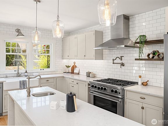 This 1924 Craftsman has been beautifully reimagined from top to bottom, featuring high-end finishes and thoughtful touches throughout. The chef's kitchen boasts quartz countertops with a BlueStar gas range, pot filler, and large island with a second sink. Enjoy heated floors in all bathrooms, a dedicated home office, + central A/C for those hot summer days. An entertainer’s paradise awaits in the private backyard retreat—complete with a built-in fridge, pizza oven, and space to gather under the stars. Enjoy gated off-street parking and prime location just blocks from Maple Leaf Park and Macrina Bakery. Just minutes to UW, University Village, Downtown Seattle, I-5, 520, and Green Lake - this is the complete package!