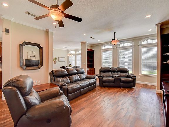 Discover your perfect escape in this stunning 3150 sqft custom 4/3/3 two-story home nestled on a beautiful and quiet loop street! 10’ ceilings and arched windows flood the living area with natural light. The split floor plan flows easily from the living room to a dream kitchen. Gather around a large island and breakfast bar with Silestone countertops, or adjoining dining area. SS appliances. Custom cabinets provide ample storage in this amazing kitchen. The serene primary en-suite has double vanities, sep. shower, jetted tub, and dual walk-in closets. Family or guests can relax in the three add. bedrooms, one with built-in desk. A separate study allows for private workspace. Unwind on the front and back porches! The large UTRM has countertops, mudroom, sink, and stor. Upstairs, is a massive 500+ sqft flex rm. w/vaulted ceiling, full bath, and walk-in attic stor. The 3-car gar. with sep. openers has vast space for everything!