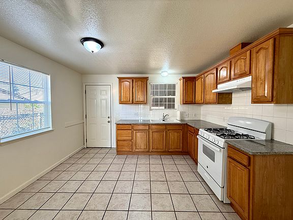 New range and hoodGranite countersSolid surface flooringCovered patio area