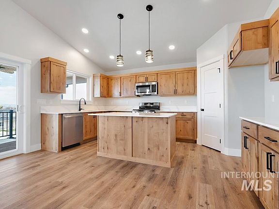 Welcome home to this beautifully finished 5 bedroom, 3 bath home offering modern style, warm tones, and functional living on a .17 acre lot. The open great room features vaulted ceilings, large windows for natural light, and seamless flow into the dining space and kitchen. You’ll love the kitchen’s wood cabinetry, center island with seating, stainless steel appliances, and generous counter space—perfect for everyday living and entertaining. The main-level primary suite provides a private retreat with a walk-in closet and bath featuring dual vanities and a walk-in shower. Three additional bedrooms and a full bath complete the main floor. The fully finished basement expands your living space with a large family movie room wired for a projector, Gym room, additional bedroom, and another full bath—ideal for entertaining, guests, or a home office setup. Outside, enjoy the covered entry, landscaped yard, and a spacious 3-car garage with RV bay, offering extra storage or hobby space. Located in a welcoming community with convenient access to schools, parks, and local amenities. Move-in ready and designed for both comfort and style—this home has room for everyone. Brand new street - From Payette turn right off of Hwy 95 onto 7th Ave., Take a left on Sandy Point St., Turn right on Bandon Dunes, Left on Pinehurst St. Schedule a showing today!