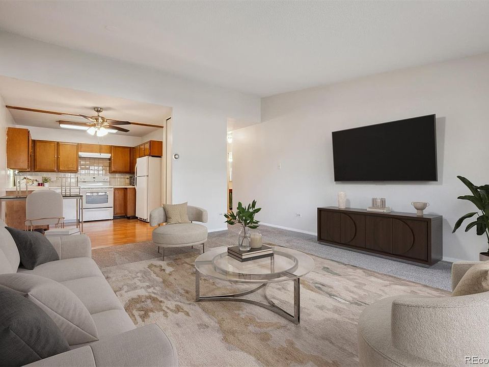 Welcome Home! This rare penthouse condo is ready to move right in...New 2-tone paint color scheme and new carpet thru-out! South facing condo & overlooks large courtyard. Elevator building with bonus storage on same floor. Great opportunity to own this 1 bedroom, 1 bathroom, 855 sf condo- including a newer 1 car detached garage w/opener. Kitchen features wood laminate flooring, white appliances, updated countertop, tile backsplash, & ceiling fan. Oversized Primary Bedroom w/2 closets & ceiling fan. Full bath w/updated lighting and triple mirror medicine cabinet. Living Room includes updated & energy efficient wall ac unit. Screen enclosed lanai w/tile floors. You will want to be sure stop by & see this one- available now!**Windsor Gardens is Colorado's Largest Age 55+ Active Adult Living Condo Community. Did you know? Monthly HOA Dues include annual property taxes! And heat, water, sewer, trash, round-the-clock patrolling community responders, full time onsite association management, grounds/building maintenance, and activities department. Enjoy clubhouse amenities such as fitness center, indoor/outdoor pools, hot tub, sauna, billiards, library, craft rooms for ceramics, sewing, woodworking, and 9 hole par 3 golf course and onsite restaurant both open to the public. Stay engaged with a wide array of activities, clubs, and events scheduled every month. Additional features include garden plot program, private walking trail and nature preserve, and RV/Boat storage. The Highline Canal runs full length along south side of the complex. RTD Bus Stops located thru-out the community. FHA/VA approved. Close to restaurants, stores, shopping…Minutes to Lowry, Hwy 225, Cherry Creek…Easy access to DIA and downtown. Come see for yourself what Windsor Gardens has to offer. ©2021**