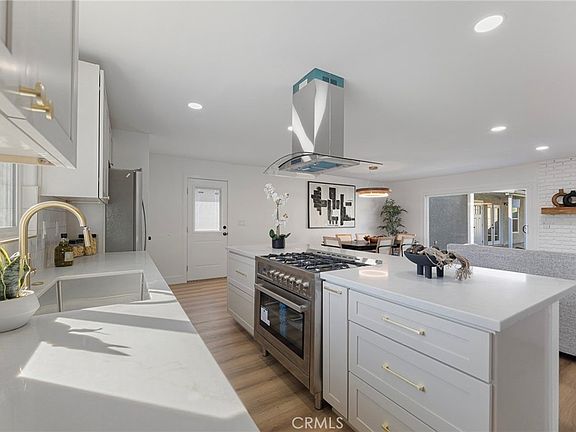 The modern kitchen features brand-new cabinetry, quartz countertops, a 36-inch range, stainless steel appliances, a walk-in pantry, and convenient indoor laundry. A large sliding glass door opens to a freshly landscaped backyard with new sod—perfect for entertaining or relaxing outdoors.