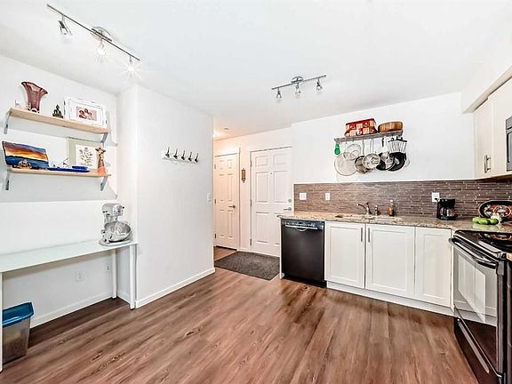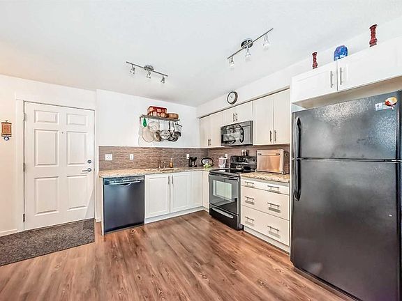 Step inside to an open-concept living area featuring laminate flooring, granite countertops, stylish white cabinetry, and matching black appliances. The bedroom has brand-new carpet and offers a generous walkthrough closet that connects directly to the 4-piece bathroom. Enjoy your private balcony overlooking the peaceful courtyard, complete with a community firepit and mountain views on a clear day. A gas line and BBQ are included, making it perfect for outdoor entertaining. Additional conveniences include in-suite laundry with a stackable washer/dryer and a handy coat closet/extra storage. This unit also comes with a titled outdoor parking stall and an assigned storage locker for extra space. Solar panels were recently installed in the complex, helping to reduce overall energy cost and improve sustainability. This is a PET FRIENDLY complex (with board approval)! The Copperfield community offers direct access to pathways, green spaces, schools, shopping, and quick access to Deerfoot and Stoney Trail. This home is a fantastic opportunity for a first-time buyer, downsizer, or investor!