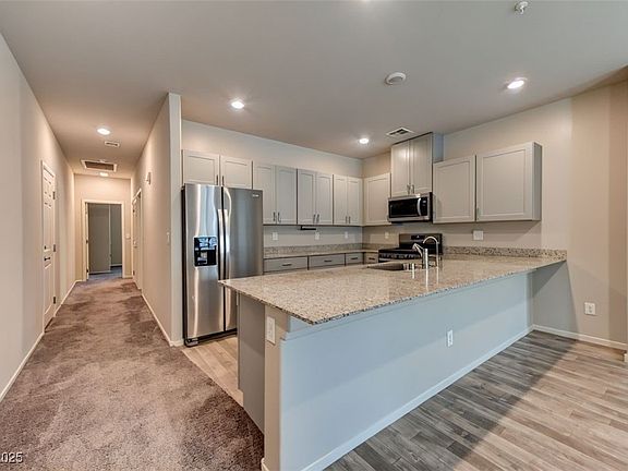 Located in the gated Valley Vista community, this 3-bed, 2-bath single-story home offers comfort, style, and smart living. Enjoy an open layout with granite countertops, 36" upper cabinets, a gas range, and stainless steel appliances—all included. Newly installed luxury vinyl flooring in living area and kitchen. Home comes with an owned solar system and owned water softener for energy savings and peace of mind. Additional highlights: stackable washer/dryer, attached private garage, USB outlets, paver driveway, and a private backyard. Just minutes from The Aliante Hotel & Casino, dining, shopping, and freeway access. This 1,265 sq ft home is move-in ready and perfectly located!