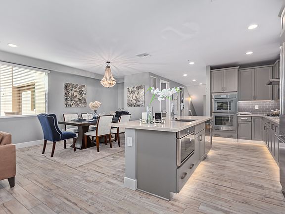 The gourmet kitchen includes stainless steel appliances, French door refrigerator, quartz countertops, double oven, modern tiled backsplash, designer faucets, island with sink, and walk-in pantry.