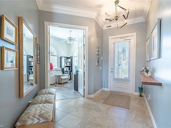 JUST REDUCED THIS UNBELIEVABLE QUALITY UPGRADED FURNISHED, poured concrete, original DiVosta built, three bedrooms/two bath with den Oakmont single family home located in the gated community of VeronaWalk. This residence has a much sought after open concept, contemporary flair. Many upgrades include crown molding, modern light fixtures/fans, tiled floors and a redesigned wall unit. A centrally located white kitchen has stainless appliances, granite counters and tile backsplash. The large primary suite has a sliding door to the pool and a hallway with closet storage on both sides that leads to a ensuite bath. Here you have two vanities, a deep soaking tub, dual entry shower and a convenient cosmetics station. A covered lanai opens to a screen enclosure housing an inviting pool. Lush landscaping has been planted behind and abuts a gentle waterway. You will be storm/security ready with accordion and electric hurricane shutters. This home will not last long in this SW Florida real estate market.
