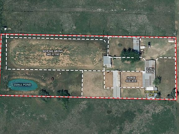 The ranch also comes with an open cab JD tractor with front end loader and implements (plow, box drag and hay fork), a horse walker and 20 ft container. It is serviced by Oklaunion Water Authority, and has electric and septic system for the apartment.