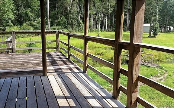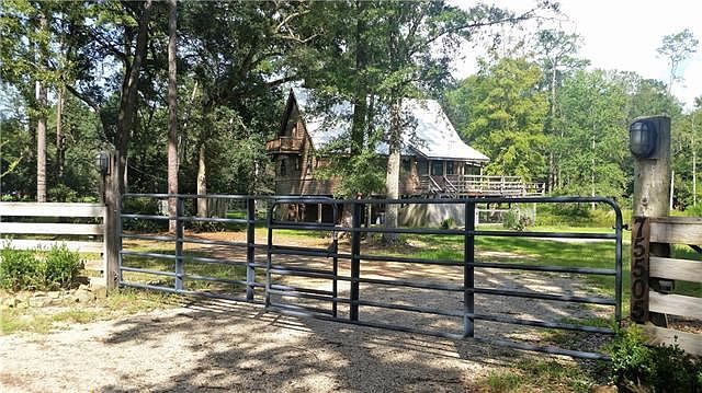 SO MUCH CHARACTER! Cute, privately gated cypress cottage on 4.05ac w/amazing views from the sunroom, balcony & expansive decking. No carpet, SS appliances, Granite, Tankless water heater. Concrete & decked ground level great for entertaining w/a half bath & storage. 2 Car att carport. Sprawling fenced areas for your furry family members. Beautiful grounds w/2 ponds. Storage shed. Warehouse on slab w/extra separate gated access. Flood zone X. Peaceful, country living just 6.5 mi from I-12. Come check it out!