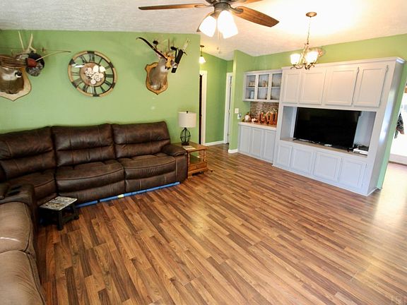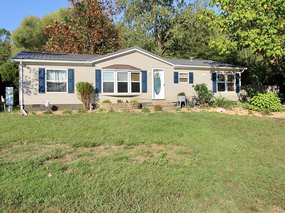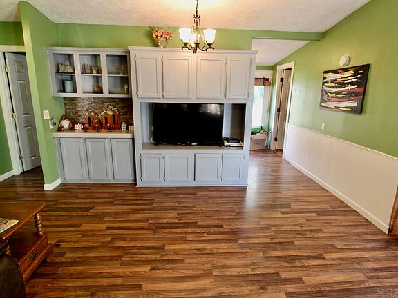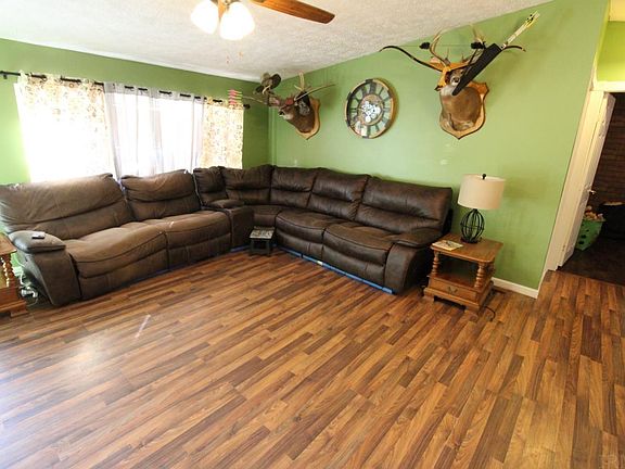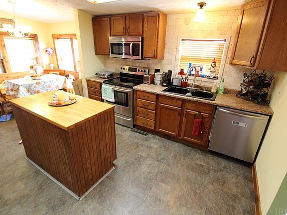 Located outside of town, this three bedroom, two bathroom home sits on a partially wooded 2.78 acre lot. Property offers secluded location and private backyard. Interior features an open layout and spacious kitchen with a center island. Kitchen also features a corner dining area with lots of natural light. Stainless steel kitchen appliances and washer and dryer are included. Primary suite features a full bathroom with step-in tiled shower. Second and third bedroom are conveniently located to second full bathroom. Updates per seller: new metal roof (2018), vinyl plank flooring (2017-2018), dishwasher (2018), newly painted outdoor shutters. Outdoor features large patio, fenced in yard, detached building and additional outbuilding. Seller is including a 1-year supreme coverage home warranty.