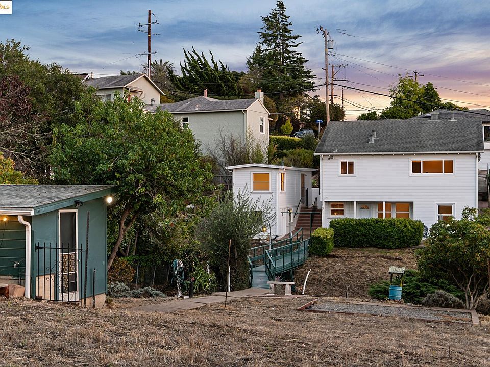 Possibilities as endless as the views! This unique property has so much to offer! Set on an extra-deep, quarter-acre+ lot (per public record), the main house features a 2-bed/1-bath unit upstairs and a 1-bed/1-bath unit below.* An adjacent structure includes two rooms, a full bath, shared laundry, and a workshop.* Cross a charming bridge over a seasonal stream to reach “Grandpa's hideaway”—a vintage retreat with a 1950s wet bar.* The lot extends to the top of the hill, where you’ll enjoy stunning, private bridge-to-bridge Bay views. Ideally perched to capture panoramic views while staying close to everything El Cerrito offers—schools, parks, shops, public transit, the Community Center, and Public Pool—ditch the car! Lovingly maintained by one family for nearly 100 years, 7553 Stockton was one of the neighborhood’s first homes. Recent updates include double-pane windows, compliant sewer lateral and upgraded electrical. The downstairs unit was refreshed in 2022 with new flooring and a renovated kitchenette. Whether you envision multigenerational living, a live/work setup, or your own urban farm, this rare property is a blank canvas ready for your dream. *Bed and bath count differs *Buyer to investigate.
