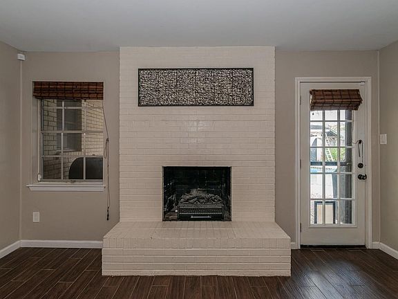 Inviting poolWood burning fireplaceCozy family roomCovered patio
