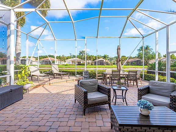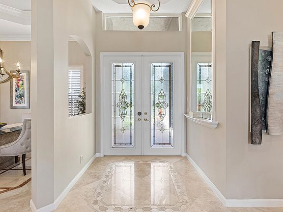 Brand NEW ROOF (Sept 2024) provides lasting peace of mind. You are welcomed by lush landscaping and elegant lighting into this beautifully upgraded 3-bedroom, 2.5-bathroom lakefront home, offering an exceptional blend of luxury and comfort. Step inside to discover sophisticated marble flooring in the main living areas, crown molding, elegant custom window treatments including plantation shutters in the Primary and 3rd bedrooms, recessed LED lighting in each room, and designer fixtures and finishes. The chef's kitchen is a true showpiece, featuring granite countertops, a stylish glass backsplash, newer stainless steel appliances(microwave 2025), and rich white wood cabinetry. Each bedroom showcases wood-style porcelain tile and custom outfitted closets. The 3rd bedroom/office features a custom barn door, adding a chic touch while opening up to magnificent lake views from the family room. Every bathroom has been fully renovated, boasting quartz countertops, frameless glass showers, and a breathtaking ensuite primary bath. The Primary bedroom includes a versatile bonus space, perfect for a private den, exercise area, or home office. Outdoor living is just as impressive, with a fully screened-in, oversized paved patio. Ideally positioned to face north, it provides the perfect setting to enjoy tranquil lake views year round while dining or entertaining.