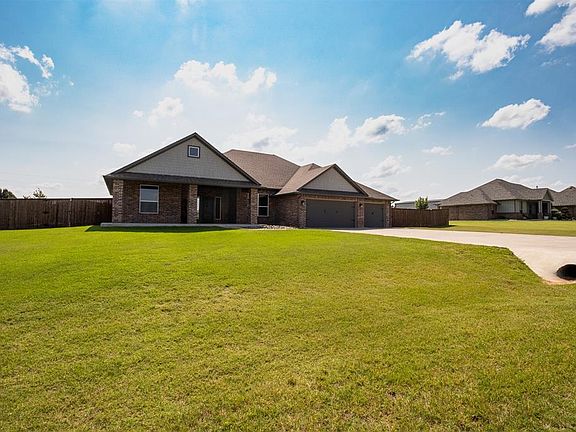 Style and quality construction by Hill's Land and Construction in this open concept styled home. The cook's kitchen is open to the living room and dining area. The Alder wood accents the contemporary colors and wood-like tile floors throughout this home. The kitchen with dining space enjoys an eating island, walk-in pantry, pull out spice racks and has ample counter space and cabinets to satisfy any cook. The primary bedroom with ensuite has double vanities, soaking tub, standing shower and seasonal walk-in closet. Outside enjoy a west facing front porch and east facing covered patio. The wood privacy fence has a double gate entry from the road. Even your furry friends will enjoy the large dog run with wrought iron fence. All outside walls are 2x6 construction. Enjoy all this on .76 acres close to major highways for easy commuting to Oklahoma City downtown, Moore, Norman, OU, Mustang, Will Rogers Airport, FAA, TAFB,