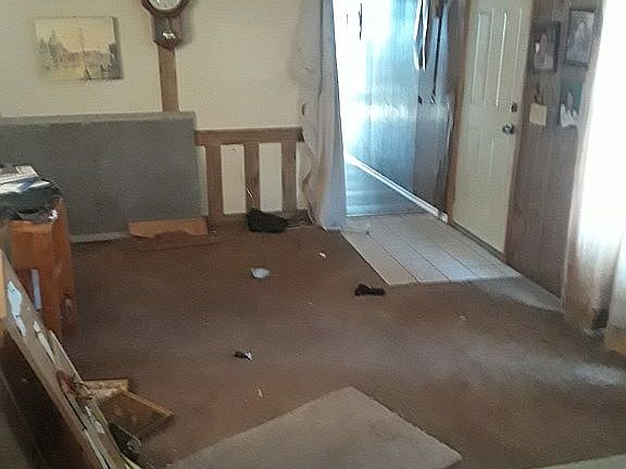 old remodeled mobile home with large garage in the front and a old cabin in the back on 1.24 acres lot. Lots of trees oak, black walnut, one peach ,and other varieties.
