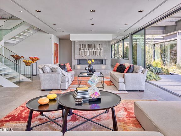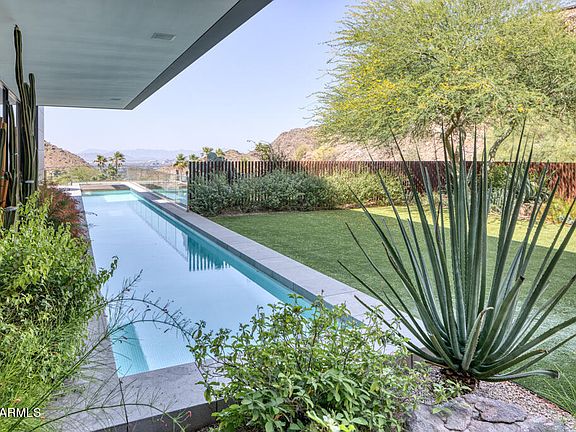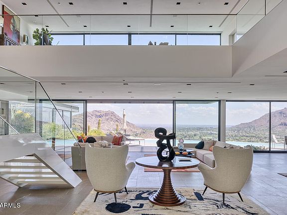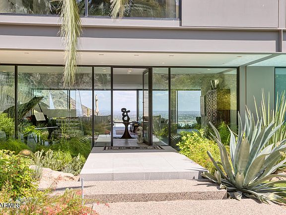 $3M price reduction! The most extraordinary Contemporary architectural masterpiece looks Brand New! This dramatic GLASS HOUSE sits high on the mountain across from Paradise Valley Country Club in a guard gated community. Walk outside from the home with no steps to 2 SWIMMING POOLS -- A 75 FT LAP POOL + an INFINITY POOL, plus dramatic + huge outside patios + a grass yard! With astounding views of CAMELBACK MTN + DOWNTOWN PHX, this both warm + sophisticated recently renovated 9,090 sqft home on 5 acres looks like it was built in 2024! 6 ensuite bedrms, including glass guest house w/ living rm, bedrm + kitchen. Floor to ceiling windows thru-out, MAGNIFICENT FINISHES, wine cellar w/ tasting rm+ 5 CAR GARAGES. This home lives like it is on flat land! The best buy in all of Paradise Valley! Designed by noted Italian Contemporary Architect, Mateo Cami.