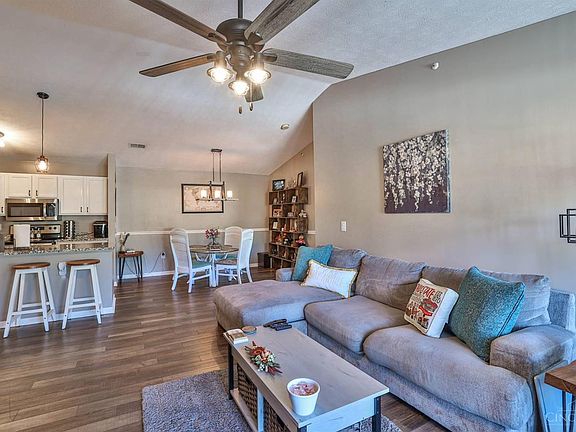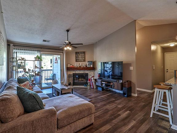 Modern 3rd-Floor condo featuring vaulted ceilings, a cozy wood-burning fireplace, granite countertops, stainless steel appliances, and LVP flooring. Enjoy convenient access to highways, hospitals, shopping, and restaurants. HOA community offers a pool, fitness center, clubhouse, walking trails, green space, and includes water and trash service. Maintenance-free living in a prime location.