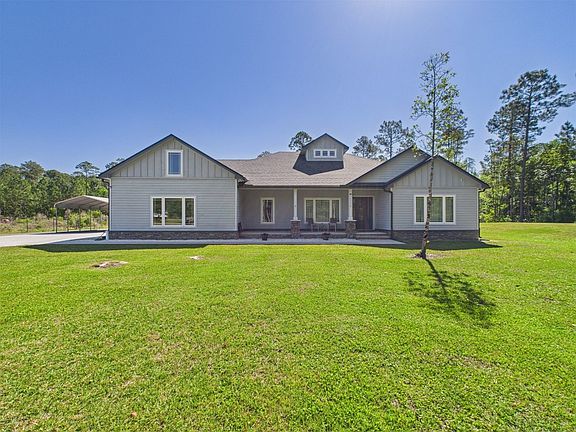 Discover the perfect blend of modern comfort and serene country living on 6.64 breathtaking acres! This stunning custom home is bathed in natural light & features bamboo hardwood flooring throughout, creating a warm & inviting atmosphere. The gourmet kitchen is a chef’s dream, boasting leathered granite countertops, SS appliances & recessed lighting. The open floor plan seamlessly connects the living spaces, w/ a wood-burning fireplace adding cozy charm. After a long day, retreat to the luxurious primary suite, where a freestanding tub promises ultimate relaxation. Upstairs, a bonus room w/extra storage offers endless possibilities. Step through the French doors to your outdoor paradise, complete with a large covered patio, extended brick paver area, & gazebo equipped w/water & electricity, perfect for entertaining or enjoying tranquil evenings. This property perfectly blends charm, efficiency & functionality! Designed with hobbyists & adventurers in mind, it features a spacious 30x40 fullyinsulated workshop with dedicated 200A service, a two-bay carport with 50A service for all your toys, & even an established chicken coop ready for your feathered friends. Efficiency takes center stage with a hybrid water heater, spray foam insulation, a 525' artesian free-flowing well with a submersible pump, & a buried 120-gallon propane tank. This home isn’t just a place to live, it’s a lifestyle where every detail is thoughtfully designed to work as hard as you do! Conveniently located near the Nassau Landing boat ramp, this property offers the perfect escape while keeping you connected to nearby amenities with NO HOA/CDD FEEs. Don't miss this unique opportunity to own a slice of paradise, schedule your tour today!